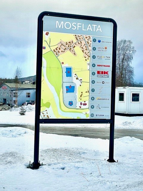 Skilt med kart over Mosflata kom opp rett før jul. Ei stor takk til Nordvest Profil som leverte skilt, Vik Ørsta som produserte stålkonstruksjonen og Anleggservice som gjorde grunnarbeidet.